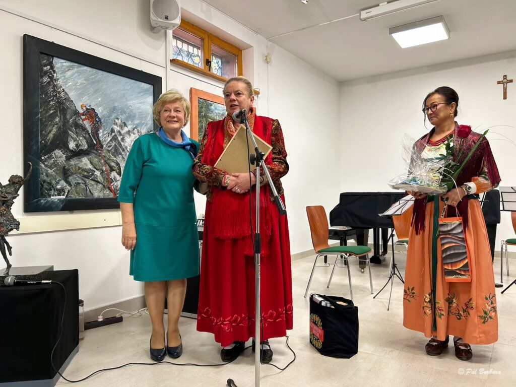 30 listopada w pierwszą niedzielę Adwentu, za sprawą Polskiego Domu Kultury na Węgrzech przy współpracy zakopiańskiego „Czerwonego Dworu” w Domu Polskim odbył się wernisaż wystawy twórczości Zofii Szwajnos, która wyrosła w tradycji góralskiego rękodzieła, jest artystką wielu talentów i pasji, w górach odnajduje swoją harmonię, żeby później z nową energią zachwycać świat malarstwem, rzeźbą, fotografią. „Góry są cząstką mnie –mówi artystka – kiedy tam uciekam znajduję ciszę, monolog, szepty, czas na przemyślenia. Tam pojawiają się nowe pomysły i powstają nowe projekty. Mimo tak wyraźnej dominanty, twórczość Zofii Szwajnos potrafi zaskoczyć wielością technik, różnorodnością faktur, tematyką. Malarstwo na tkaninach towarzyszy jej od ćwierćwiecza. Obok niego artystka zajmuje się fotografią, ceramiką, rzeźbą w brązie, wykonuje też biżuterię artystyczną.). Kuratorem wystawy jest dyrektor „Czerwonego Dworu” dr Małgorzata Wonuczka Wnuk, która w imieniu tej znakomitej zakopiańskiej instytucji podziękowała za wieloletnią bardzo owocną współpracę kończącej misję na funkcji dyrektora Polskiego Domu Kultury na Węgrzech Monice Molnárné Sagun.